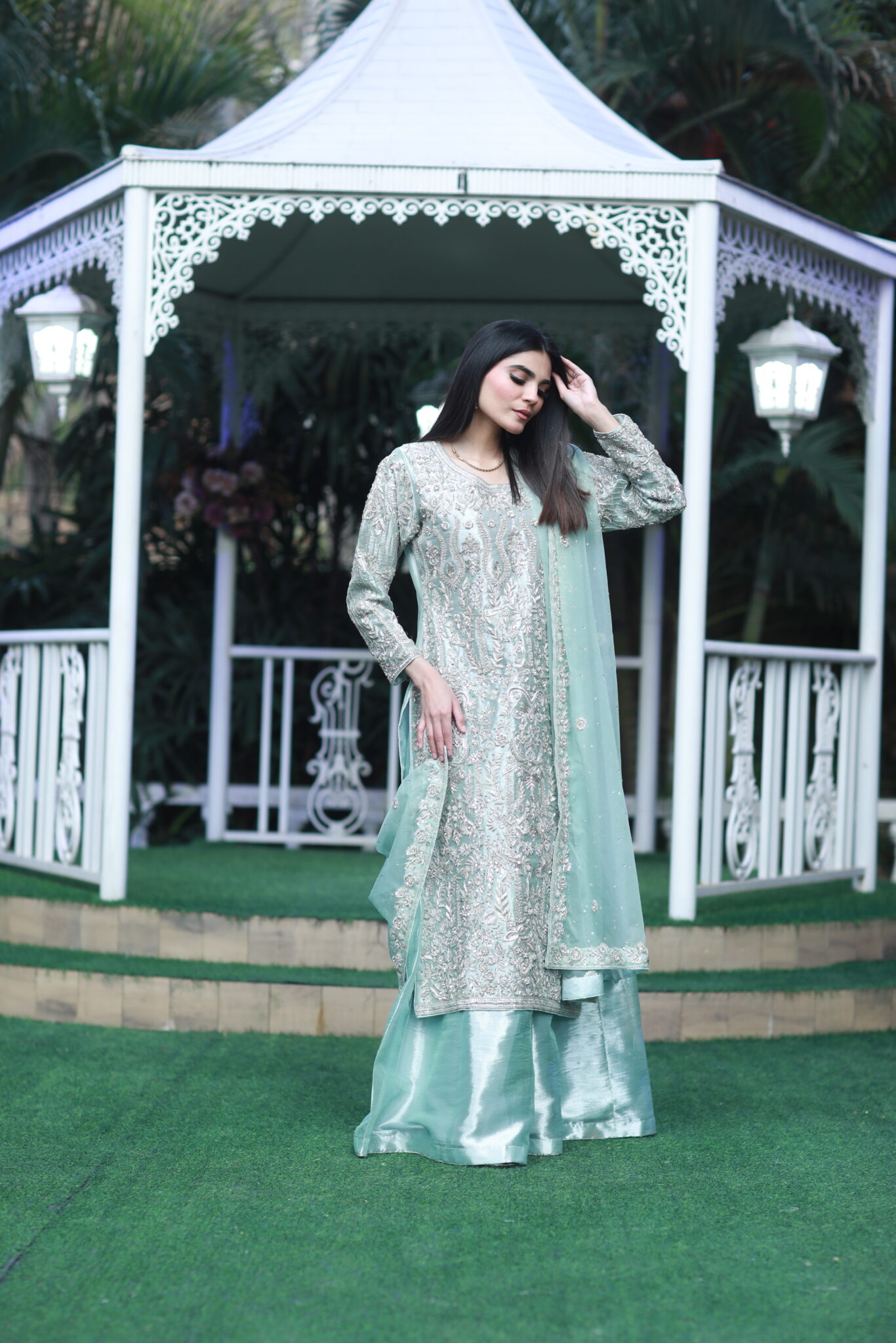 reflects subtle luxury. The long kameez is beautifully paired with a flowing flared gharara-style