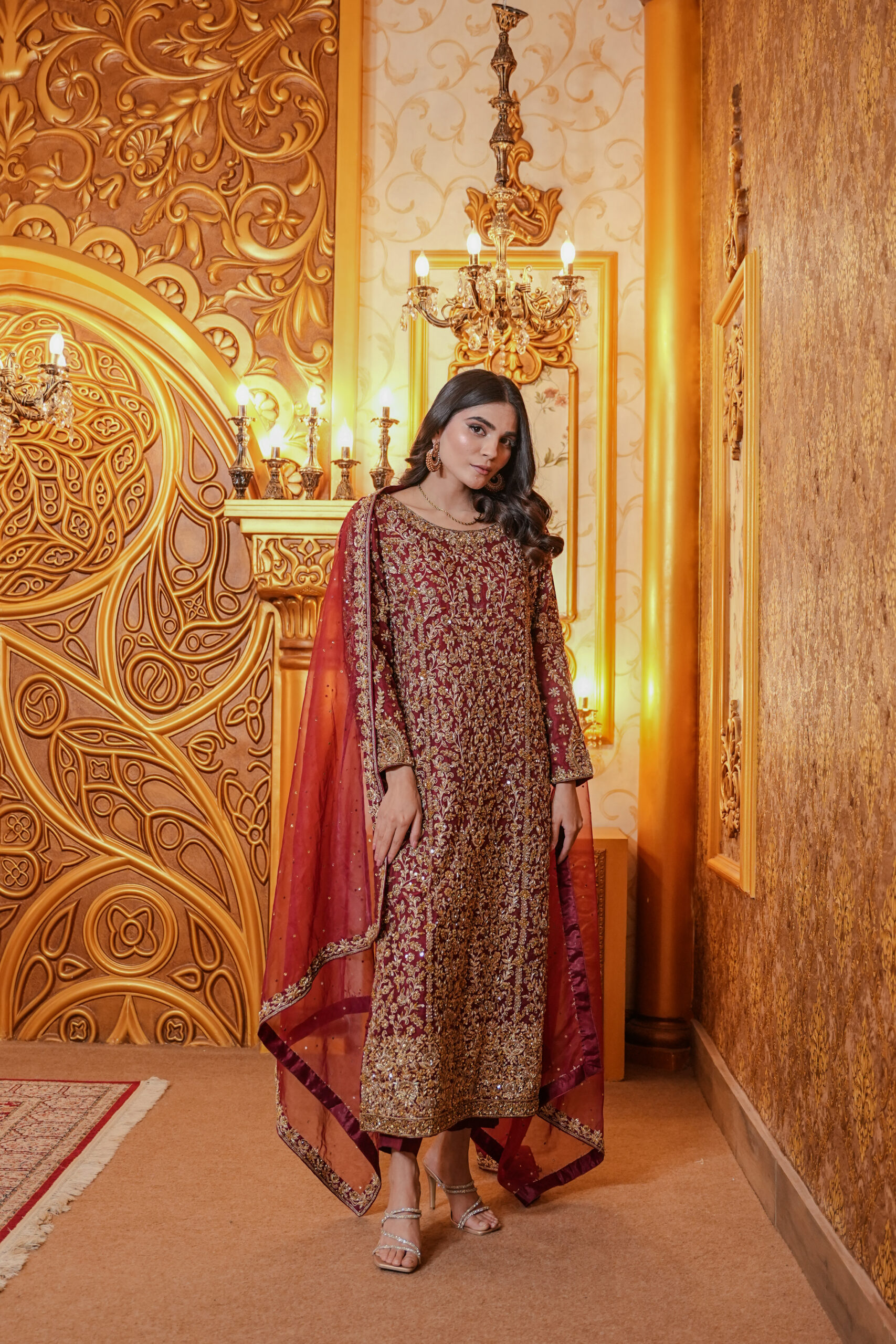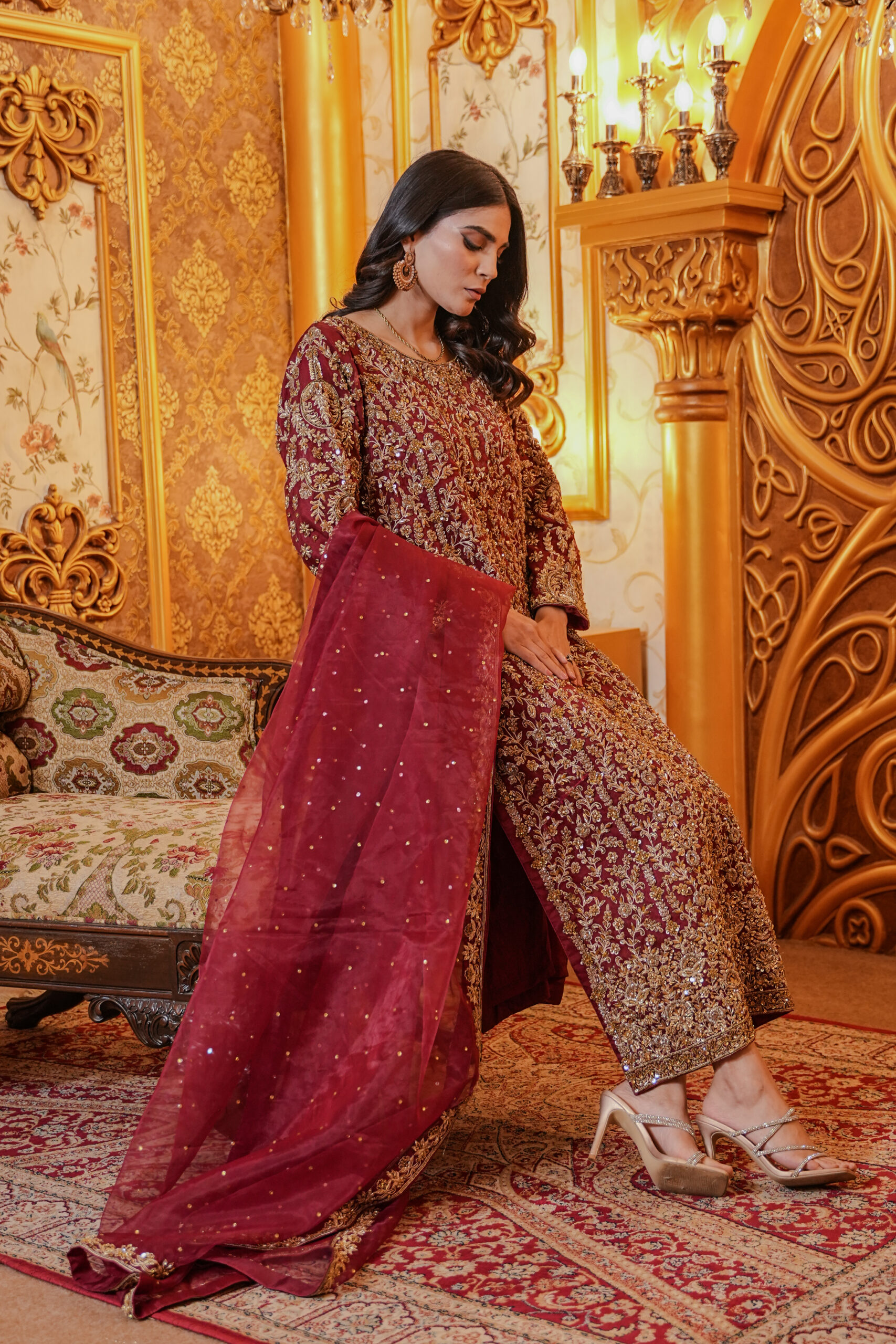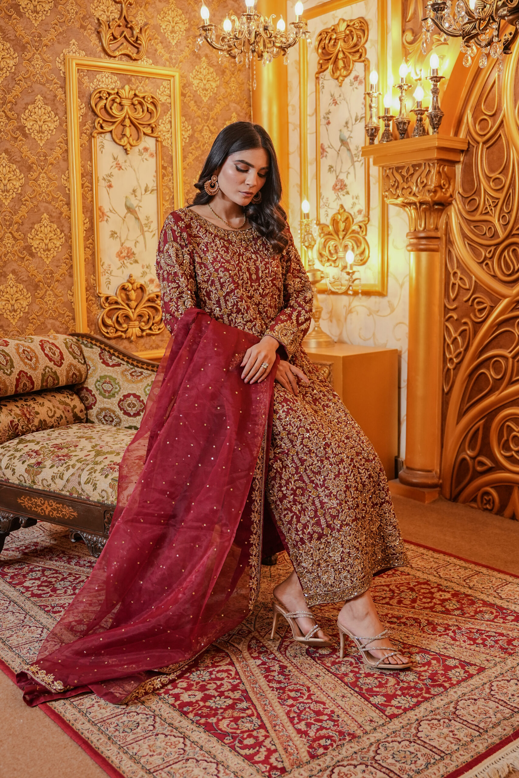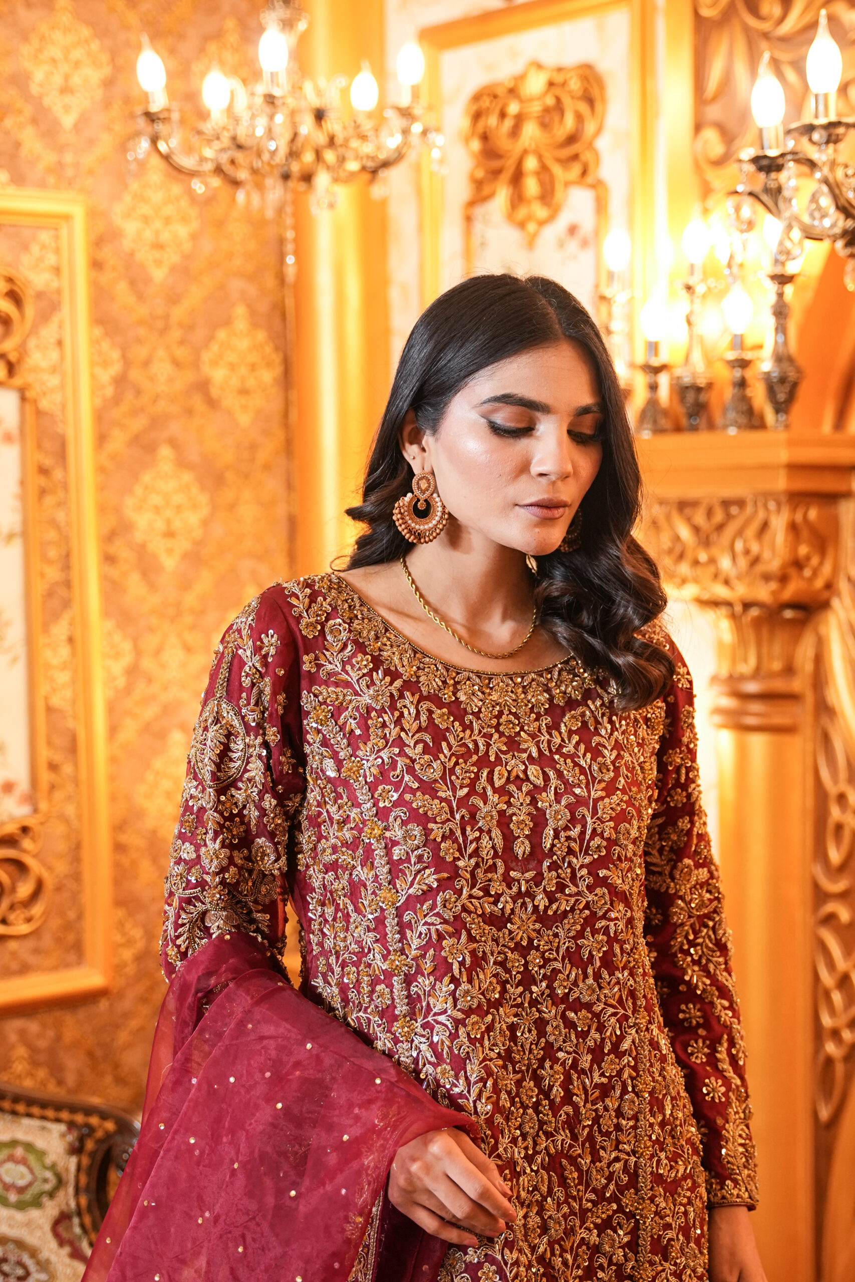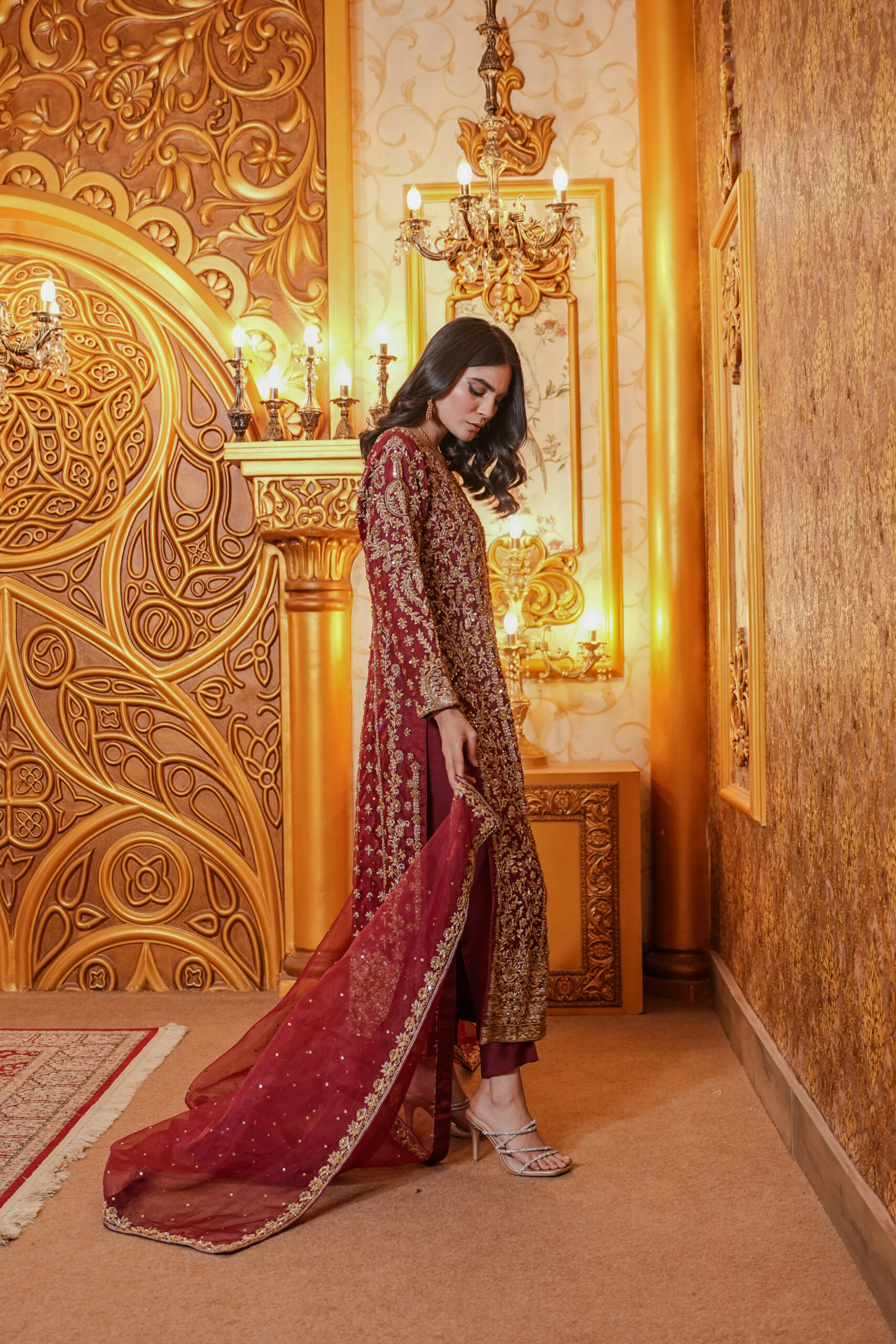 depth, grandeur, and a couture finish. Paired with a sheer maroon dupatta, delicately sprinkled
